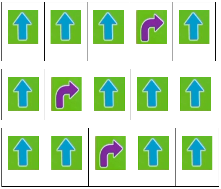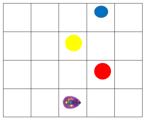 - Поместите свою мышку на нижнюю строку поля в клеточку посередине мордочкой вправо. Первые две мышки составляют алгоритм движения до желтой лампочки, следующие две мышки составляют алгоритм движения до синей лампочки, последние две мышки составляют алгоритм движения до красной лампочки.