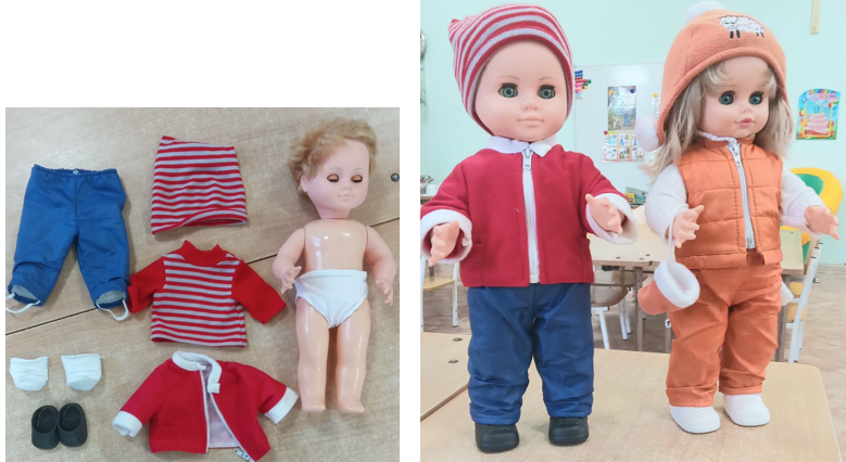 Наглядным пособием выбрать кукол с набором верхней одежды. На ней в свободное время дети могут тренироваться и оттачивать свои знания на предмет одевания и раздевания.