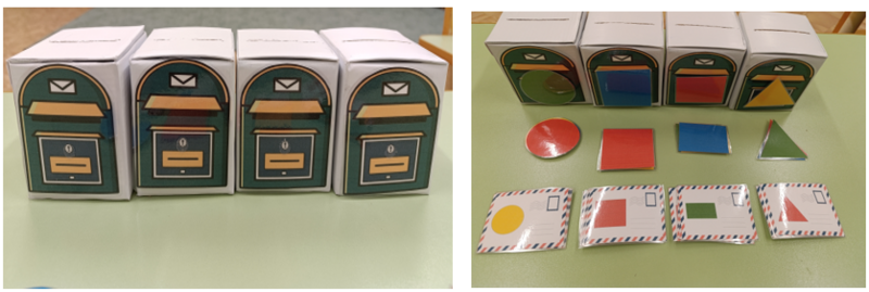 Воспитатель показывает детям «почтовый ящик» и предлагает отправить письмо Зайчику (любая другая игрушка). Но письмо можно отправить только такой же формы и такого же цвета, как фигура на «ящике». Детям предлагается рассмотреть карточки (письма) с изображенными на них фигурами квадрата, прямоугольника, круга, треугольника, красного, синего, желтого и зеленого цвета. Дети называют фигуру и ее цвет «на «почтовом ящике», находят подходящее «письмо» и кладут в коробку.