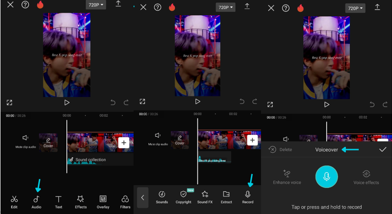 · Изображение: Две части. Слева: ребенок говорит в микрофон или в диктофон на телефоне, изображая голос персонажа. Справа: скриншот интерфейса программы CapCut с дорожками видео и звука.