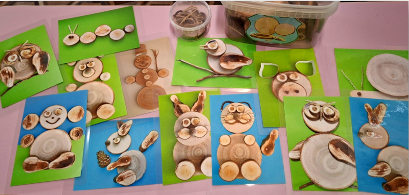 - Игровой материал: карточки-схемы, набор деревянных спилов разного диаметра и толщины (от маленьких до крупных), хорошо отшлифованных и безопасных для детей. Дополнительные элементы (мелкие детали из фетра, пуговицы или семена для глаз; кусочки войлока или меха для хвостов; фоновая основа-полянка из фетра или рамочка)