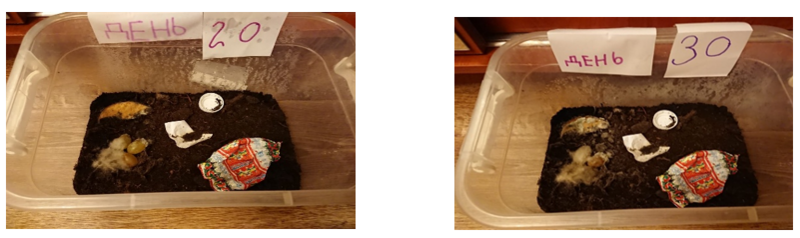 В течение 30 дней мы наблюдали за тем, как меняются отходы в земле. В дневнике наблюдений вели записи, фиксировали изменения различных видов мусора. По прошествии месяца нами был сделан вывод: органические отходы разложились, пластик, бумага и фольга остались без изменений. Вывод: эти материалы нельзя просто выбрасывать, их нужно правильно утилизировать!