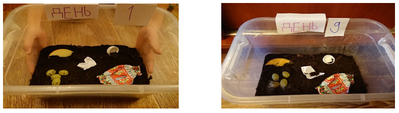 Совместно с детьми был проведен эксперимент, цель которого – наглядно показать, как разлагаются или не разлагаются отходы. Для этого использовался контейнер с землей и разные виды мусора (фантик от конфеты (фольга), пластиковая крышка, кусочек бумаги, виноград, кусок яблока).
