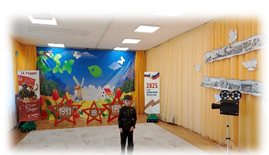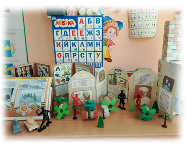 Открытие совместной выставки детских работ, семейных реликвий и фотографий «Мы помним!» размещались детские работы, книги, фотографии, атрибуты для сюжетно-ролевых игр (рис. 6). Кульминацией месяца стала проведение мероприятия «День Победы» объединила все полученные знания и впечатления. Дети приняли непосредственное участие в акции памяти – возложении цветов к местному памятнику воинам-землякам (рис.7), читали стихи (рис.8), пели песни военных лет «День Победы», «Герои-солдаты», исполняли танец «Журавли» (рис.9), участвовали в инсценировках.